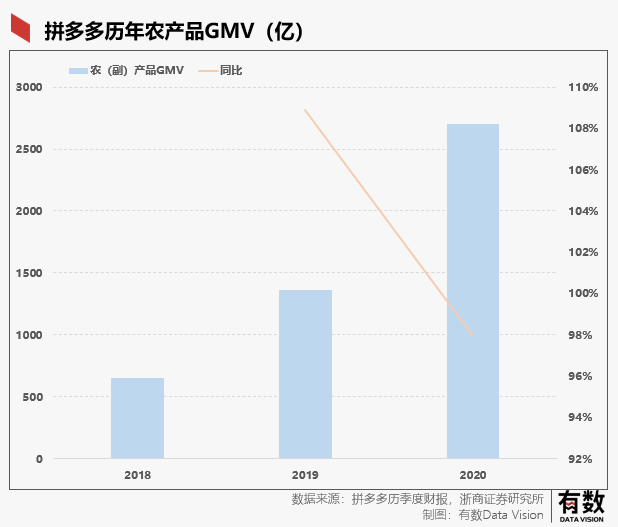 在这模式加持下,拼多多2018年农副产品GMV仅为653亿,2019年翻番达到1364亿,2020年再次增长至2700亿,三年增速达到4倍左右,现在的拼多多已经是中国最大的农产品电商平台。