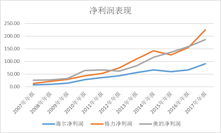 在2007-2017这十年中,油价最高触及147元,而最低则触及26元的低点,同时地产行业也经历了多个周期。从结果看,这种经济周期的变化并没有影响白电三巨头的营收增长,也并没有阻止三大白电巨头净利润的持续增长。