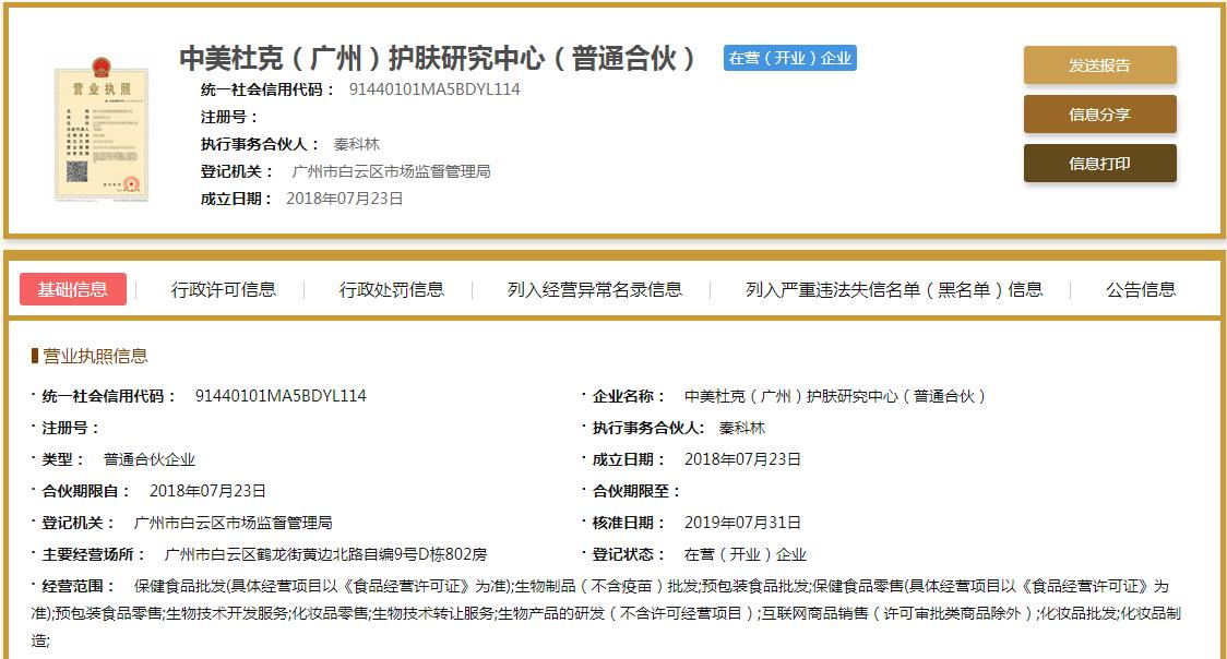 据广州市市场监管局行政处罚信息内容显示,2021年11月30日,监管局接到举报后依法对中美杜克(广州)护肤研究中心(普通合伙)(下称中美杜克)进行检查,发现该公司对其所销售的产品的功能作引人误解的商业宣传,遂依法立案调查。