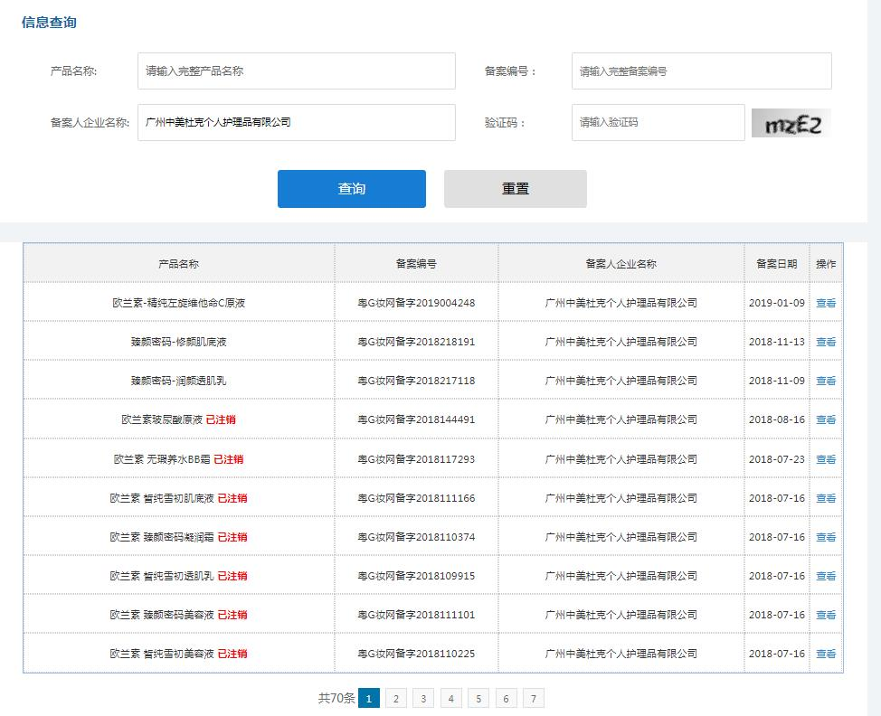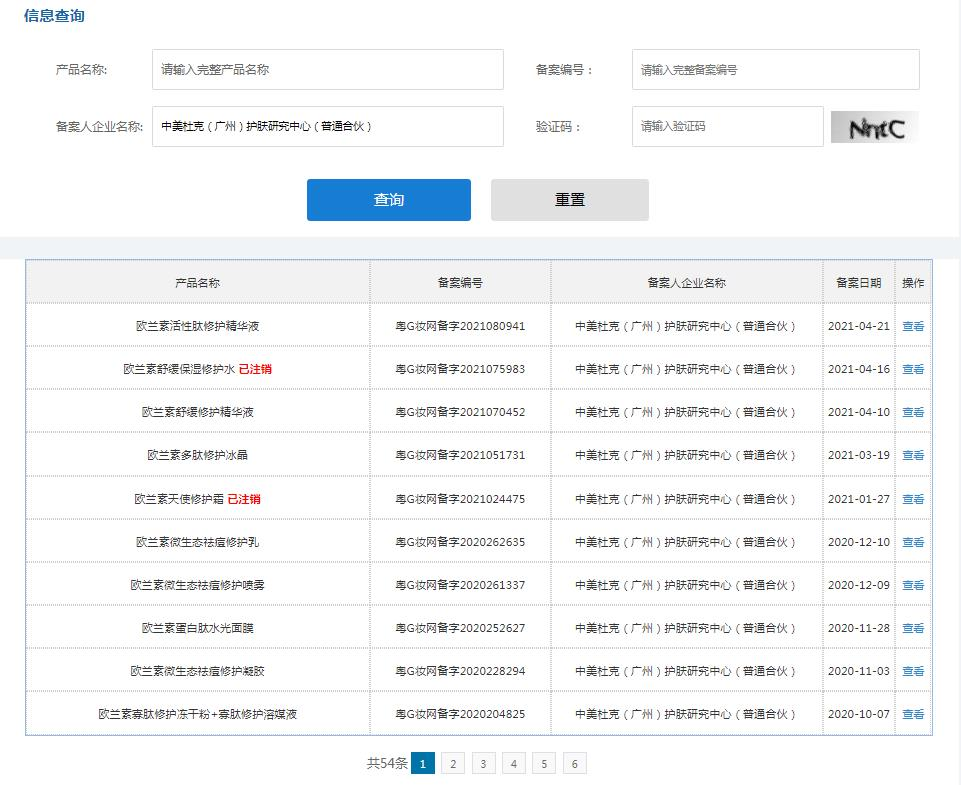 值得一提的是,这两家公司备案的普通化妆品大多数显示为“已注销”状态,仅有10余款产品是正常备案状态。其中,上述涉案的十多款产品中,臻颜密码寡肽表皮修护原液、欧兰素天使修复霜等5款产品的备案已注销,其余产品的备案信息显示正常。