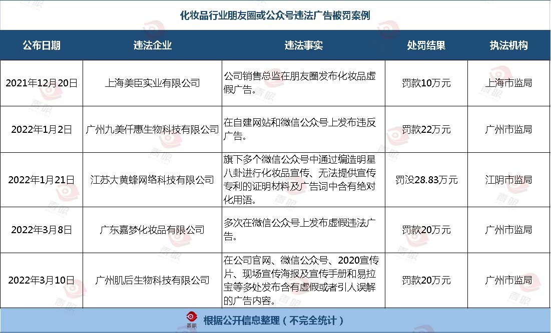 据悉,今年1月初,上海美臣实业有限公司(下称上海美臣)曾因公司销售总监在朋友圈发布化妆品虚假广告,公司被处以10万元罚款(详见《员工在朋友圈乱打广告,公司被罚!》)。