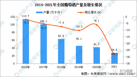 中商产业研究院数据库数据显示,2021年全国葡萄酒产量为近年来最低值,2021年全国葡萄酒产量为26.8万千升,同比下降29.1%,产量持续下降。