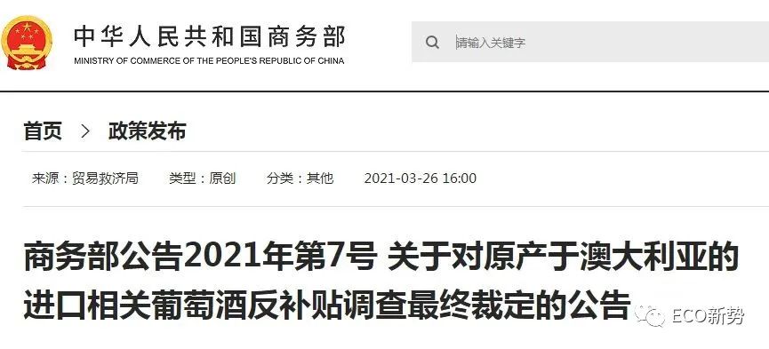 2020年12月11日起,商务部对澳进口葡萄酒实施临时反补贴措施;2021年3月28日商务部裁定,我国开始对原产澳大利亚进口葡萄酒征收反倾销税,进口澳大利亚葡萄酒产品将产生116.2%至218.4%的反倾销税,为期五年。