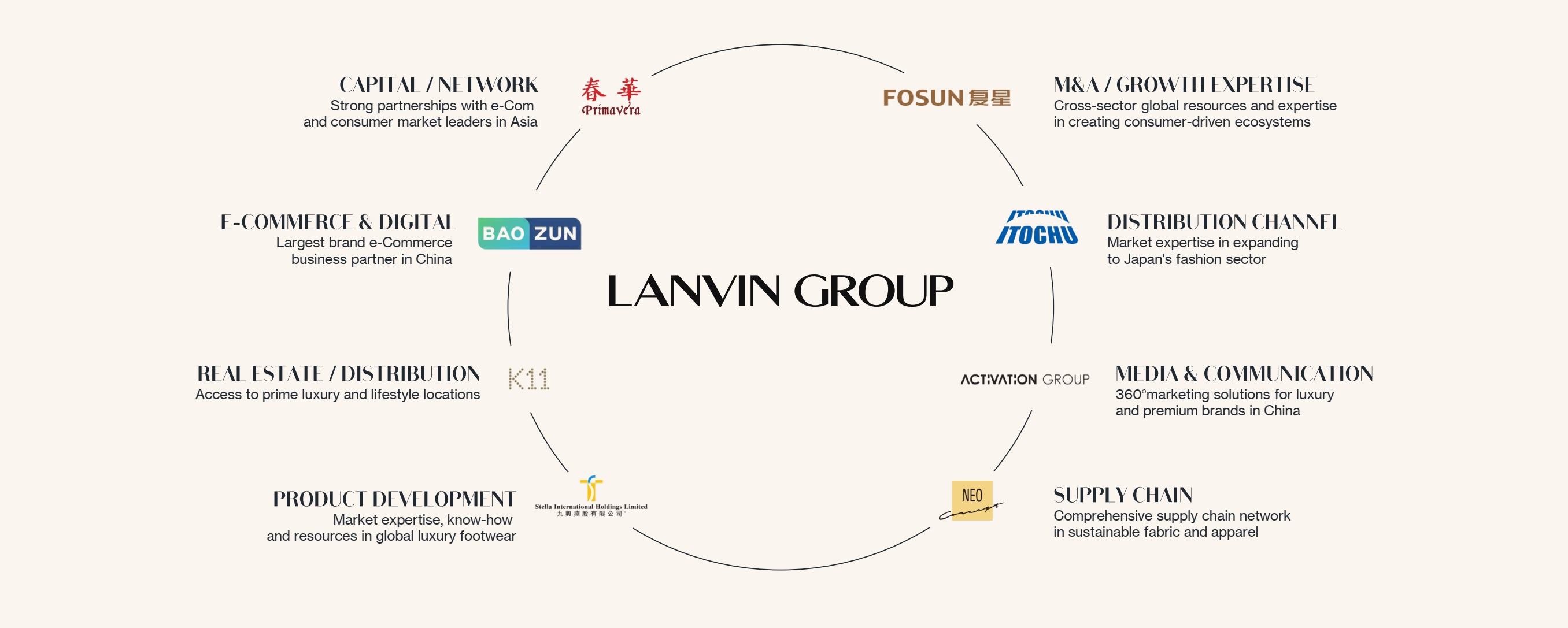 除 Lanvin 外,复朗集团旗下的主要品牌还包括:意大利奢侈鞋履品牌 Sergio Rossi、奥地利奢侈亲肤衣物品牌 Wolford、美国经典针织女装品牌 St. John Knits 以及意大利高端男装制造商 Caruso。