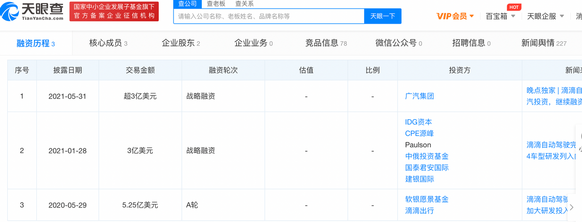 2019年,滴滴宣布旗下自动驾驶部门升级为独立公司,专注于自动驾驶研发。根据天眼查APP显示,目前该自动驾驶项目经历三轮融资。