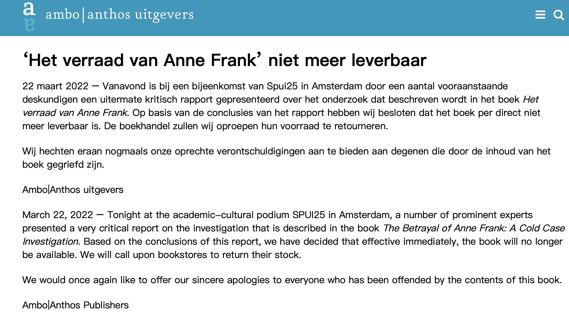但仅仅过了两个月,荷兰出版商Ambo Anthos便宣布将不再出版该书,理由是书中研究发现遭到了多方质疑,其中包括5位荷兰知名历史学家,他们于本周发布了公开的考据报告。 “基于这份报告的结论,我们决定自现在起立即下架这本书,”Ambo Anthos在致歉声明中写道,“我们将从各大书店召回已有的库存。”