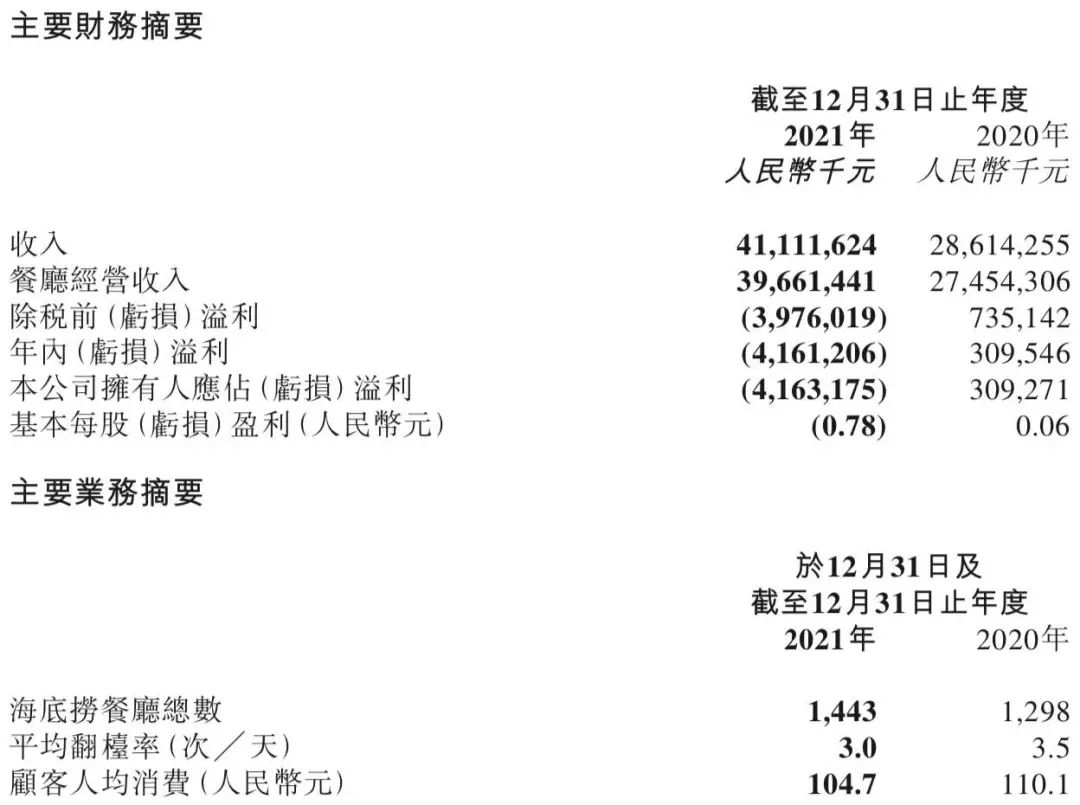 3月23日晚间,海底捞发布2021年全年业绩公告,营收411亿元,亏损高达41.6亿元,几乎相当于此前三年的利润总和。亏损情况在其一个月前发布的“预期净亏损约38亿元至45亿元”预警范围内。