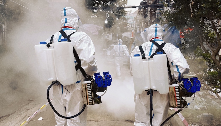 这种大规模的防疫消杀工作,一般都安排在公共场所营业结束之后进行,通过喷洒消毒水来对物品进行消杀。这听上去很容易,但由于消杀面积大、时间长,对这些小伙子来说,是体力和意志的双重考验。