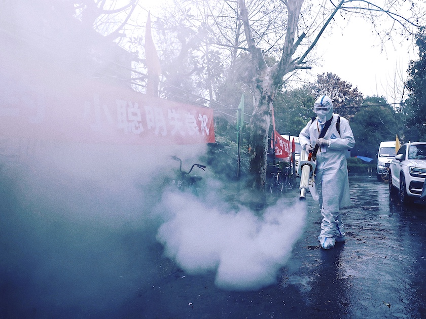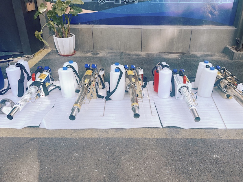 无论身处室内室外,队员们都要穿戴整套防护服,背着迷雾枪,不间断地重复弯腰-起身动作,进行消杀作业。在装满了消毒药剂之后,消杀使用的迷雾枪重达三四十斤。队员们在工作前,通常需要互相帮助才能把枪背上。