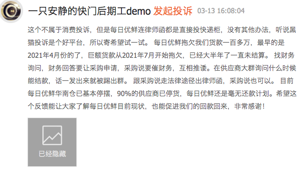3月13日,在黑猫投诉上,也有一位网友发起投诉,称“每日优鲜拖欠巨额货款大半年了”,投诉涉及的金额为110万元。
