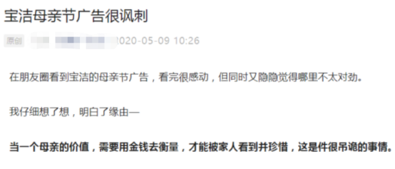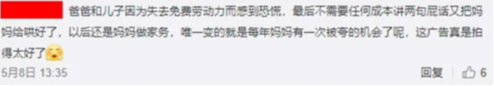 然而,这则名为《妈妈的工资》的广告,却在消费者中引起了截然相反的两种情绪。一种声音认为,宝洁关注到女性在家庭中的付出,十分令人动容,而另一派却表示,用“工资”的形式衡量女性的价值,十分侮辱和讽刺。