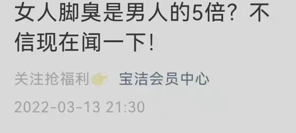 3月13日,宝洁会员中心公众号发布了一篇名为《女人脚臭是男人的5倍,不信闻一下!》的推文,并在10天后被翻出来骂上热搜。