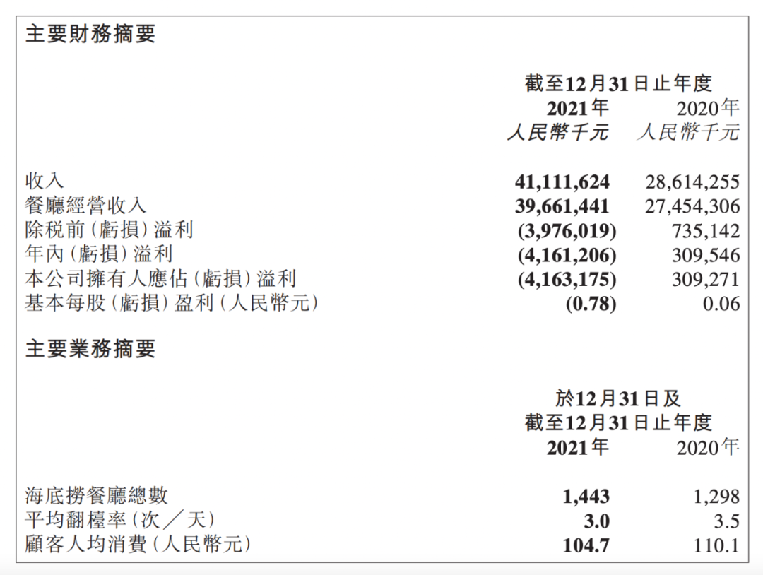 财报显示,2021年度,海底捞收入为411.12亿元(人民币,下同),同比增长43.7%。去年,海底捞由盈转亏,股东应占亏损为41.63亿元,同比上年,股东应占溢利为30.93亿元。