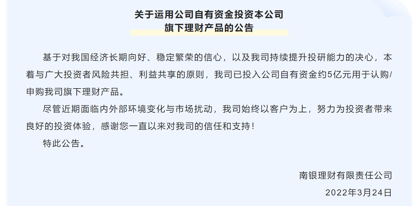 3月24日晚间,南银理财公告,基于对我国经济长期向好、稳定繁荣的信心,以及公司持续提升投研能力的决心,本着与广大投资者风险共担、利益共享的原则,公司已投入自有资金约5亿元用于认购/申购公司旗下理财产品。