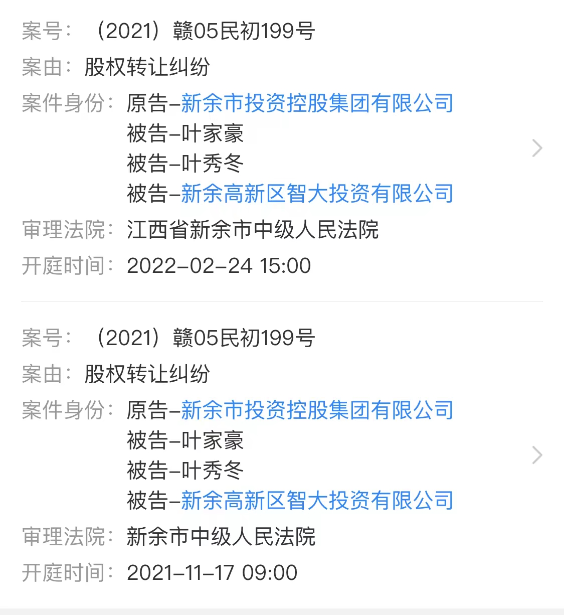 然而,一年后,新余投控与智大投资就股权转让事宜的相关纠纷升级。天眼查显示,2021年11月17日、2022年2月24日,双方诉讼已进行两轮,新余投控是原告,智大投资、叶秀冬及原实控人叶家豪。目前关于具体的股权转让纠纷事宜,双方并未披露更多细节。