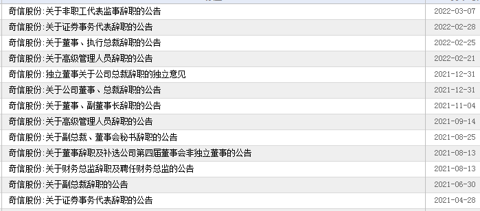 2022年2月21日,奇信股份称,其高级副总裁张翠兰因个人原因提请辞去公司高级副总裁职务。随后2月25日,该公司董事、执行总裁罗卫民辞职。2月28日,去年才上任的证券事务代表宋声艳辞职。3月7日,奇信股份非职工代表监事张清平辞职。