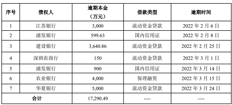 3月24日,奇信股份公布,近期因流动资金紧张出现部分银行贷款逾期的情形,2022年2月6日至3月24日,公司涉及7个银行的贷款本金合计约1.73亿元的本金已经逾期,占公司2020年经审计净资产的12.13%。