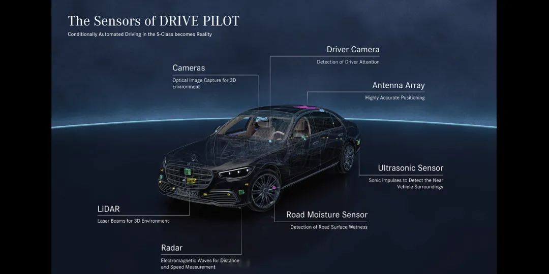 为实现L3级的自动驾驶,装载Drive Pilot的S级轿车在L2级驾驶辅助基础上额外配备了激光雷达、后置多功能摄像头和麦克风以及车轮湿度传感器等,以检测车辆周围的所有环境并确保安全。