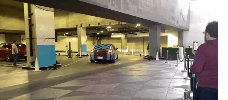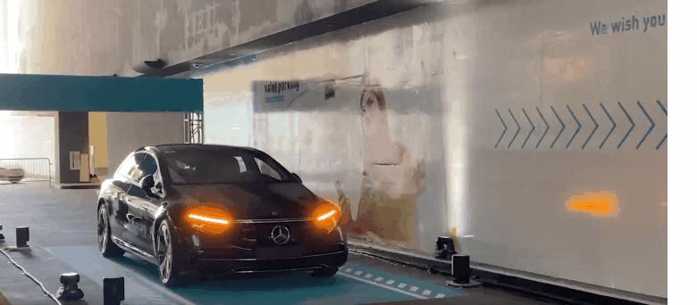 奔驰的展示,代客泊车距离更远,对场地的识别更精准。