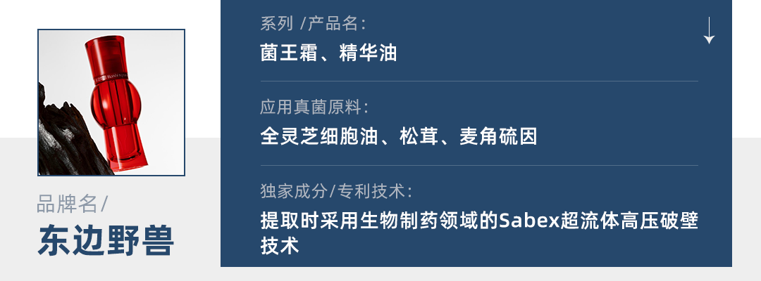2021年新上线的东边野兽定位于东方草本护肤,主要结合了现代生物医药技术,主打“灵芝细胞油”成分。