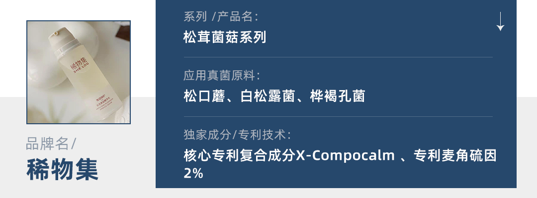 在稀物集研发的核心专利复合成分X-Compocalm中,添加了松口蘑提取物、白松露菌提取物、桦褐孔菌提取物和专利麦角硫因,富含三萜类化合物、多酚、多糖等成分,具有抗氧、修复等功效。