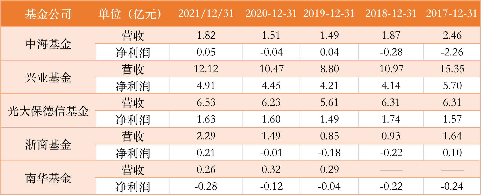 24日晚间,兴业银行等多家金融机构披露2021年全年业绩,控股/参股的基金公司的营收数据也随之公布。5家公募公司净利润排名依次为:兴业基金、光大保德信、浙商基金、中海基金、南华基金,分别为4.91亿元、1.63亿元、0.21亿元、0.05亿元、-0.28亿元,部分中小型基金公司依旧挣扎在盈亏线上。