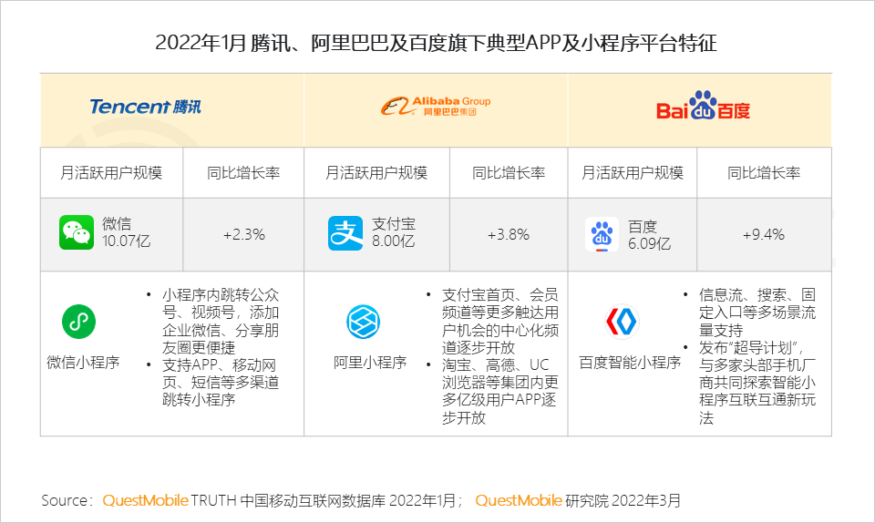 2、BAT基于旗下头部APP流量优势,持续完善小程序平台功能及商业环境,吸引玩家入驻的同时实现对流量价值的深度开发