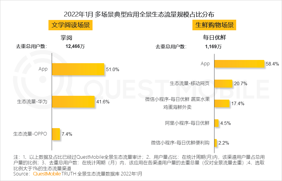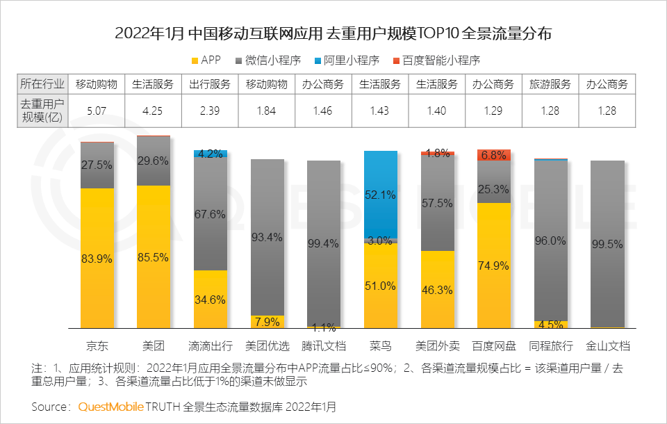 3、小程序流量助力各大平台突破流量瓶颈,TOP10全景流量应用均达到亿级规模,购物、生活及办公等领域更多应用实现多渠道布局