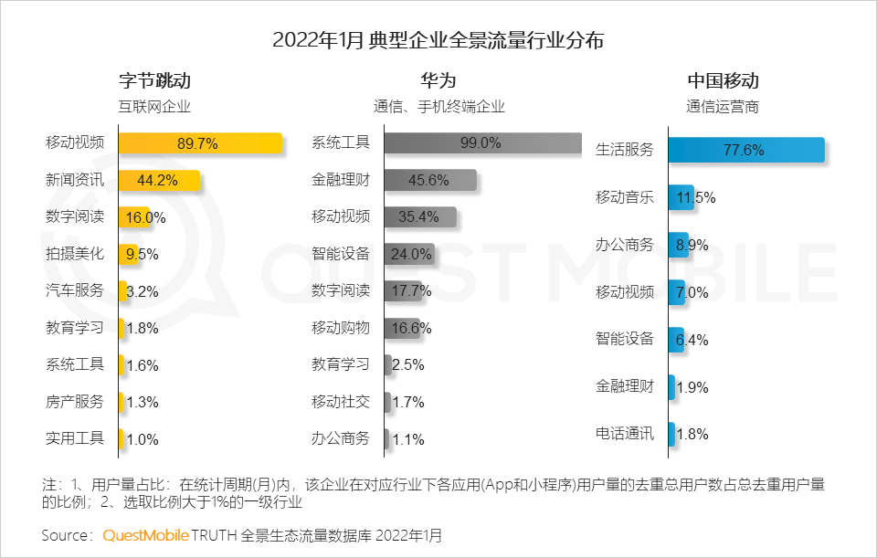 以字节跳动为代表的互联网企业流量集中在视频、资讯等内容领域,手机终端企业主要通过系统工具类应用获取流量,并向金融理财、视频等多行业扩充,通信运营商重点布局生活服务行业。