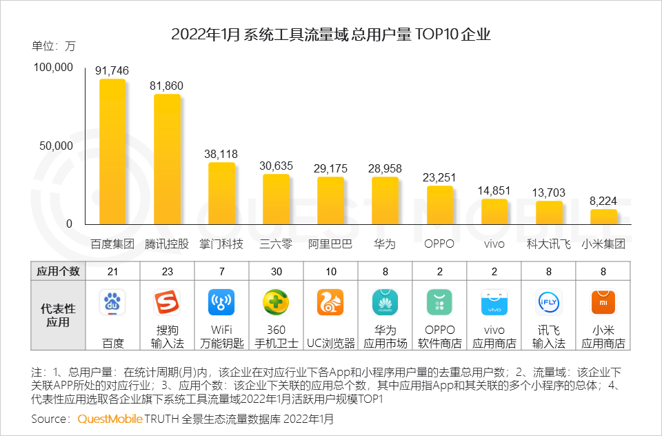 1.1 系统工具行业,百度与腾讯领先优势明显,华为、OPPO、vivo等手机厂商凭借终端优势占据亿量级流量入口