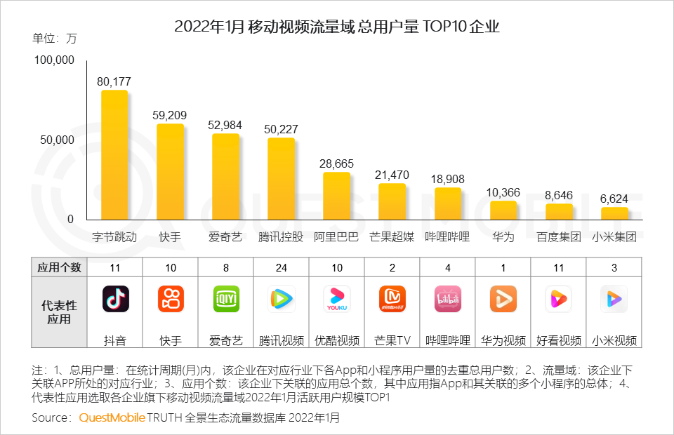 2.1 移动视频行业,字节跳动、快手短视频流量领跑,BAT在线视频流量紧随,视频平台广告投放热度不减