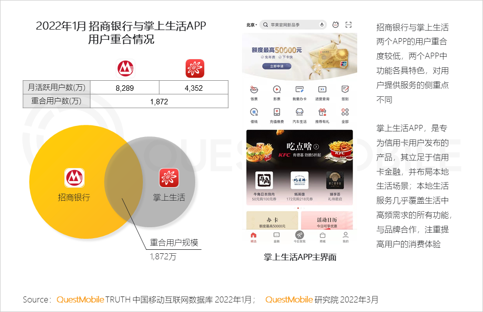 3.3 招行用户主要来源为招商银行和掌上生活APP,通过侧重功能不同吸引多类型用户,特色的本地生活服务助力用户量提升