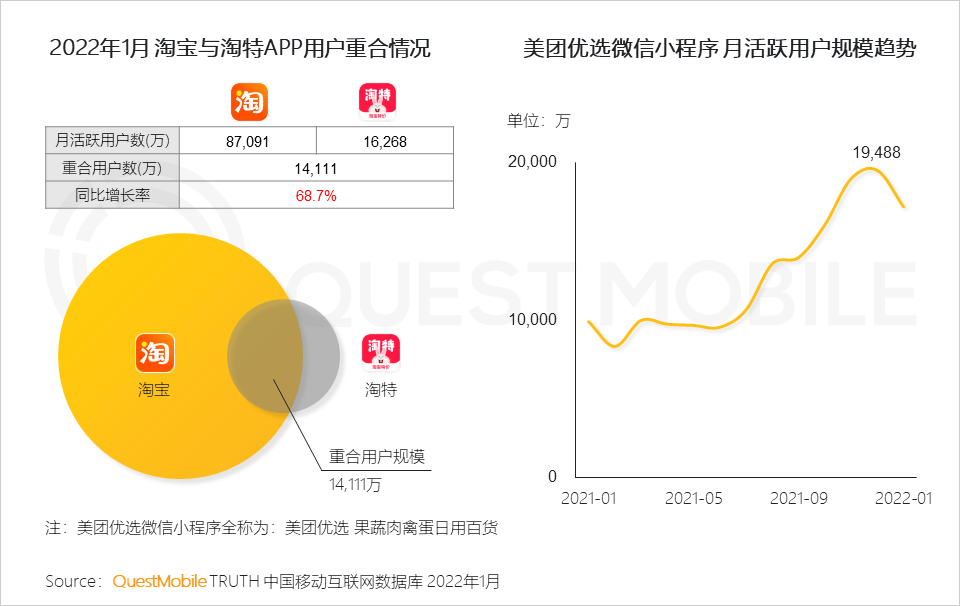 QuestMobile数据显示,阿里巴巴旗下淘宝与淘特APP重合用户规模已达1.4亿,同比提升68.7%;美团优选微信小程序近一年流量提升显著,峰值近1.95亿 。