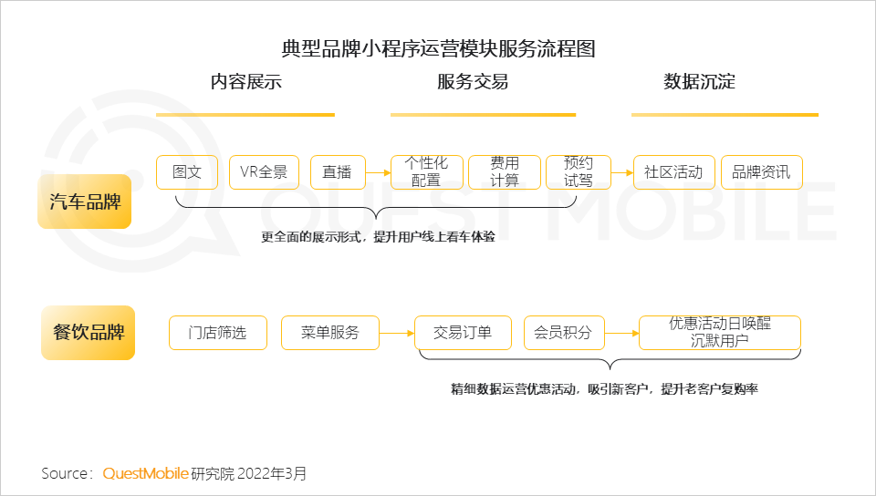 2、以汽车、餐饮类品牌小程序为例,基于各自行业特点加深核心运营板块服务能力,提升 “获客”、“转化”、“留客”效率