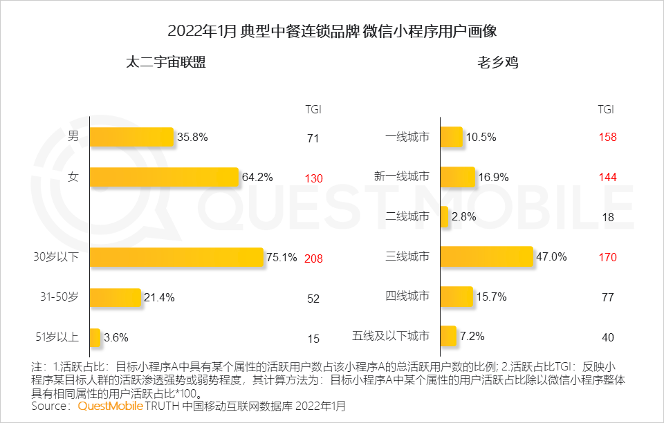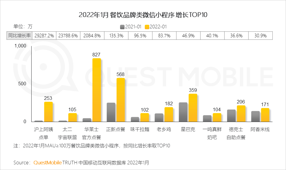 QuestMobile数据显示,太二酸菜鱼、正新鸡排、老乡鸡等中餐连锁品牌微信小程序增长显著, 2022年1月同比增长分别达到238倍、135.3%和83.7% 。