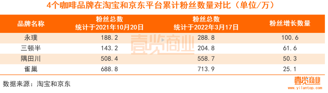 其中,永璞的粉丝增长幅度最大。《壹览商业》去年10月份曾统计过永璞、三顿半、隅田川、雀巢等四个品牌在淘宝和京东两个平台的粉丝数量。通过对比,在过去的5个月,永璞的粉丝数量增长了100.6万,为四个品牌中粉丝增长最快的,其次是三顿半,增长了61.6万,隅田川第三,雀巢最后,仅增长25.1万。