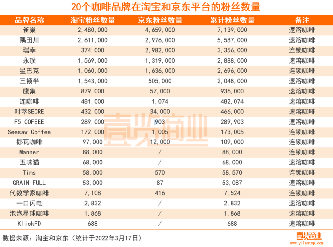 近日,《壹览商业》统计了20个咖啡品牌(含13个速溶咖啡和7个连锁咖啡品牌)在线上的数据。数据显示,截至3月17日,这20个咖啡品牌在京东和淘宝的粉丝数量累计超过2645万。其中6个品牌的粉丝数量累计在200万以上。