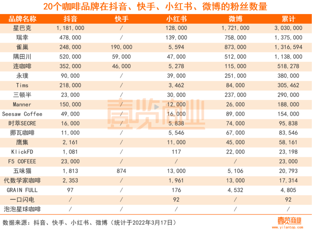 在粉丝数量上,有4个品牌的粉丝数量累计在100万以上。其中,星巴克遥遥领先,在抖音、小红书和微博的粉丝数量为303万,其次是瑞幸137.5万、雀巢131.6万、隅田川113.8万。而在淘宝和京东排行前六的永璞和三顿半粉丝仅为30多万。连锁咖啡品牌Tims和Manner的排名则有所提升。
