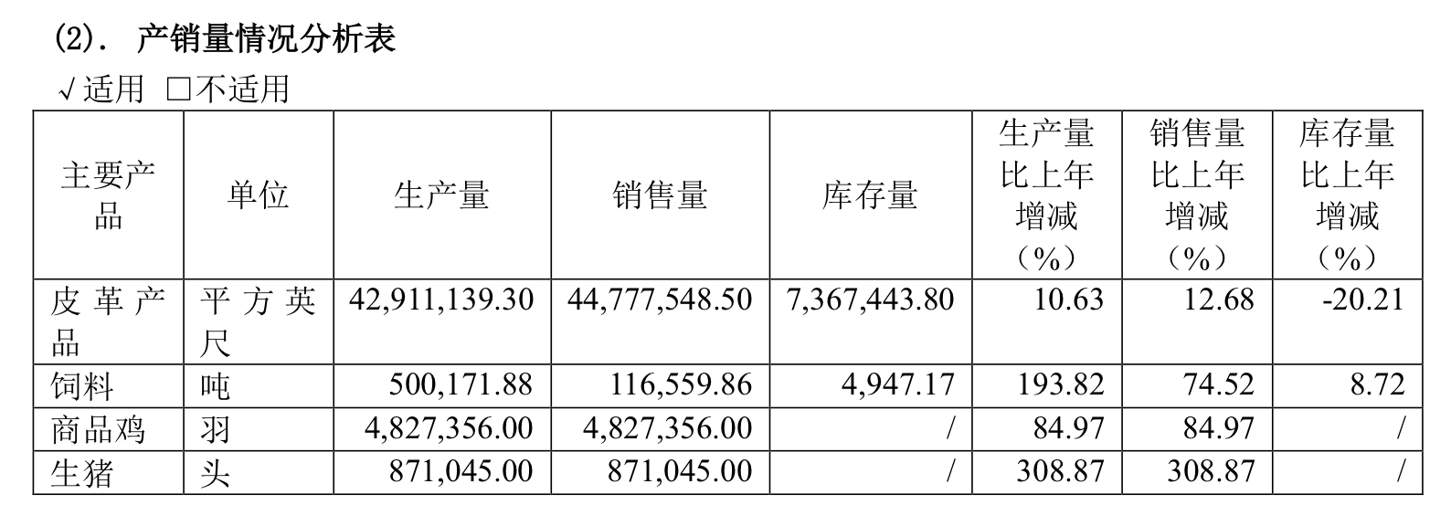 资料显示,上市公司在2020年7月收购巨星农牧有限公司,主营业务由中高档天然皮革的研发、制造与销售变更为畜禽养殖、饲料生产与销售及中高档天然皮革的研发、制造与销售,养殖业务成为公司主要的收入来源。2021年,巨星农牧养殖业务实现主营业务收入24.78亿元,同比增长了156.75%,占到公司主营业务收入的83.34%,其中生猪出栏量达87.1万头,饲料生产量达50.02万吨,商品鸡482.74万羽;皮革业务也有所增长,产量4291.11万平方英尺,实现主营业务收入4.95亿元,占总收入的16.66%。巨星农牧的生猪产销都较上年同期增长了308.87%。值得一提的是,在2020年年报中,公司曾表示2021年力争出栏生猪120万头,现实数据与预期有一定差距。