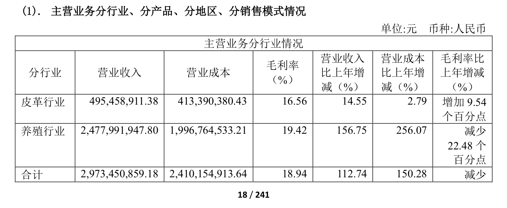 然而需要指出的是,养殖业务报告期内实现主营业务收入24.78亿元,同比增加156.75%;主营业务成本19.97亿元,同比增加 256.07%,综合毛利率19.42%,较上年度减少22.48个百分点。主要系当期生猪养殖规模扩大,生猪出栏量较上年大幅增加,主营业务收入和成本相应增加;随着全国生猪产能的不断恢复,报告期内生猪销售价格较上期出现大幅下降,同时饲料等原材料价格上涨,成本增加幅度超过收入增加幅度,导致毛利率较上期有所下降。另一方面,皮革业务随着公司产能不断恢复以及降本增效措施的实施,综合毛利率16.56%,较上年度海增加了9.54个百分点。整体看,2021年综合毛利率为18.94%,较上期下降了12.16个百分点。