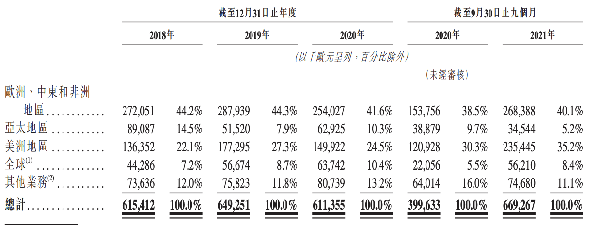 根据招股书,法拉帝的订单主要来自欧洲、中东和非洲地区,其次为美洲地区。以2020年为例,欧洲、中东和非洲地区的占比为41.6%,美洲地区的占比为24.5%,2021年前九个月则分别为40.1%和35.2%。