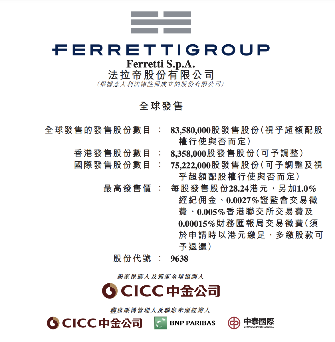 近日,豪华游艇制造商Ferretti S.p.A.(下称“法拉帝”,HK:09638)开启招股,拟全球发售8358万股股份,其中香港发售股份835.8万股,国际发售股份7522.2万股,另有15%超额配股权,预计将于3月31日于港交所主板挂牌上市。