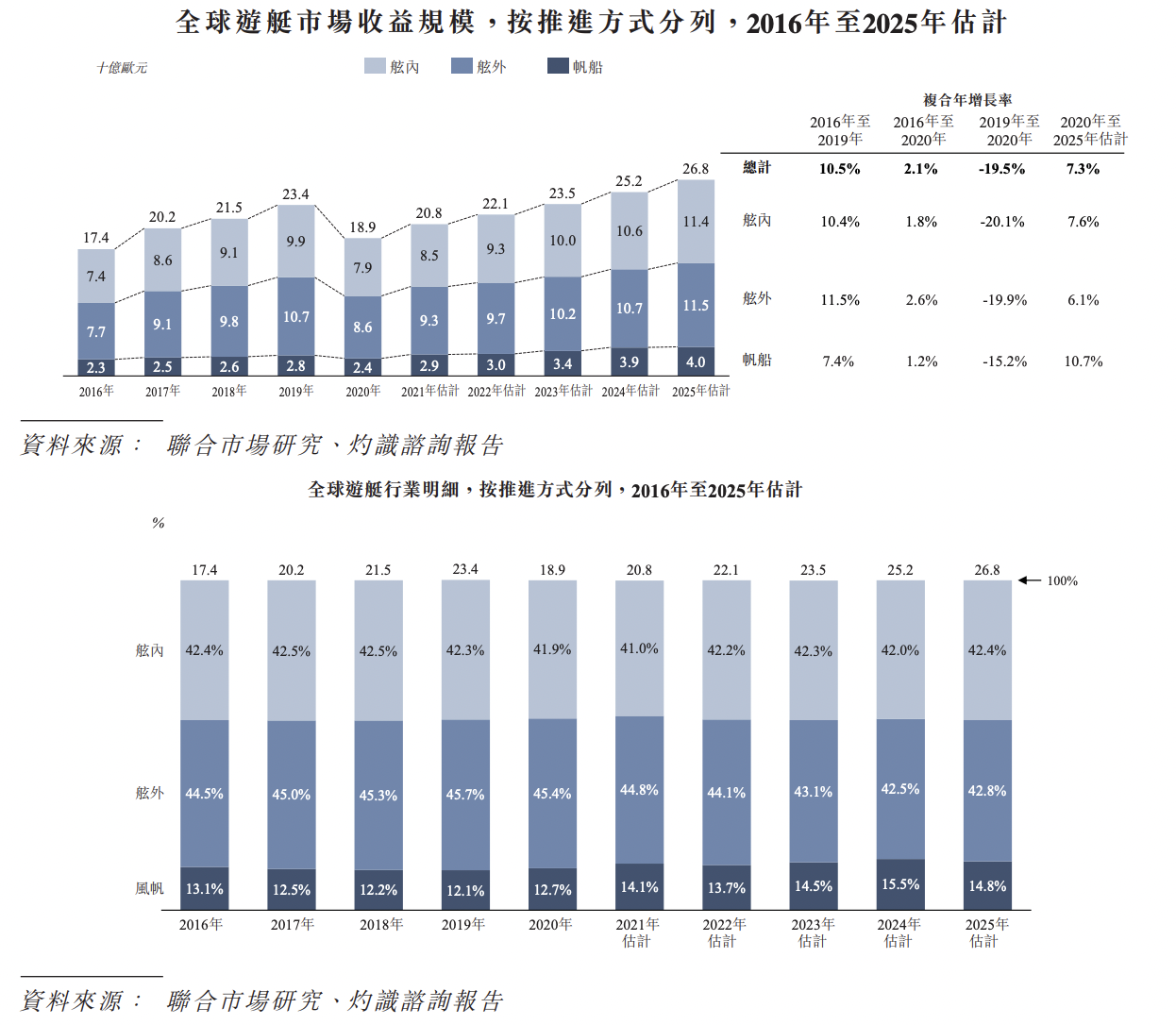 据灼识咨询预测,全球游艇业将以7.3%的复合年增长率由2020年的189亿欧元增长至2025年268亿欧元,2020年至2025年期间的复合年增长率为7.3%,并称“全球疫情改变了高净值人士和超高净值人士的生活方式,增加了他们的游艇消费意愿”。