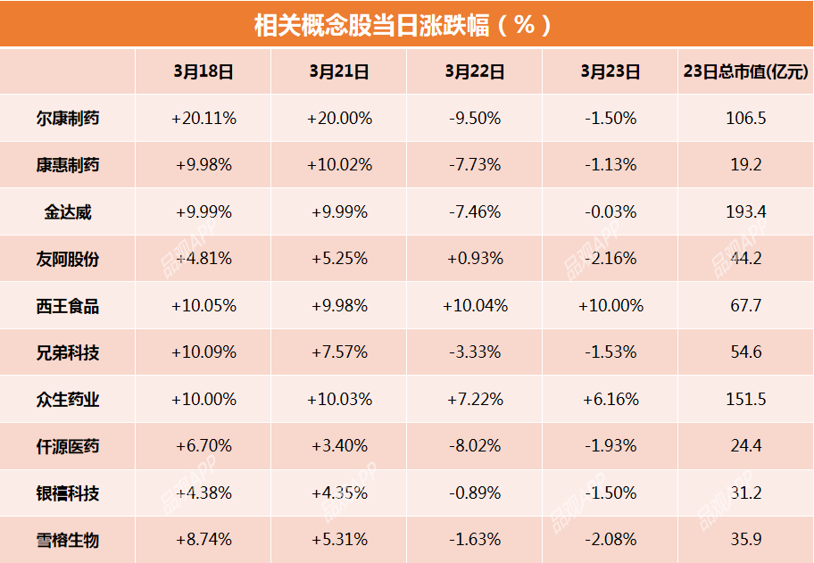 此外,尔康制药、康惠制药、金达威、兄弟科技等7股股价“2连涨”。3月18日、21日,尔康制药拿下2个20%涨停板,2个交易日累计涨幅逾44%。