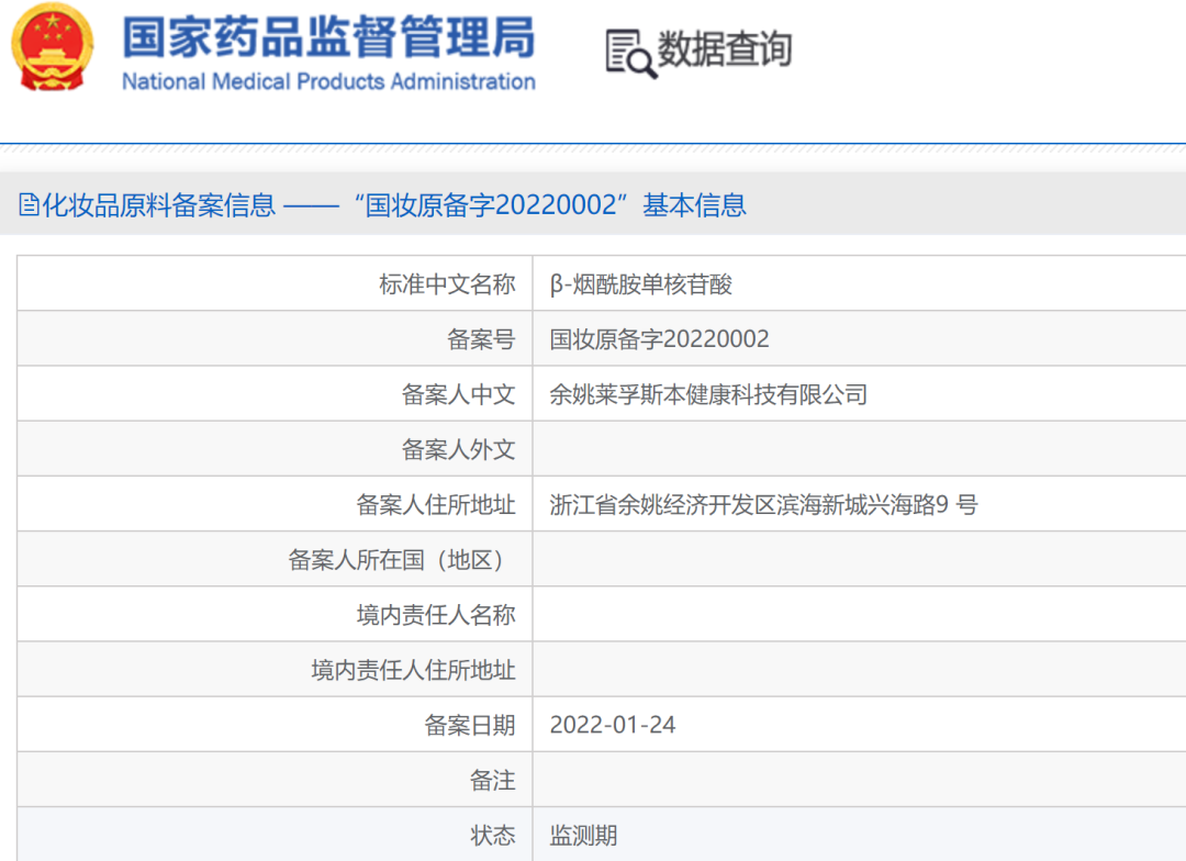 值得一提的是,就在今年1月,国家药监局NMPA公示了NMN物质可作为化妆品新原料备案通过的信息,备案公司为余姚莱孚斯本健康科技有限公司,系“不老药业”基因港名下全资子公司。这也是今年第2款通过药监局备案的化妆品新原料。