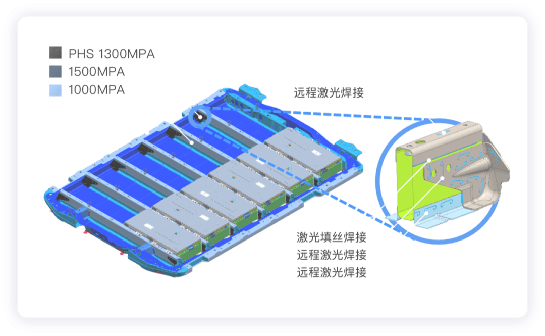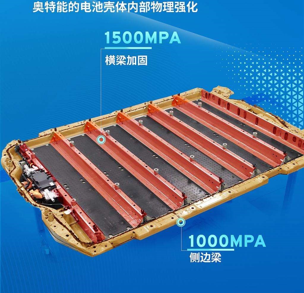 首先,在电池物理防护方面,奥特能电池包采用高强度井字形结构,采用多根1500MPA 超高强度钢横梁进行加固。电池包高强钢应用占比约61%,超高强钢应用占比37.5%,强度相较于市面上常见的低压挤压铝或铸铝优势明显,整包的抗挤压性能为国标要求的 3 倍,属于同行业最高水平。同时,电池壳体内应用远程激光焊23.2米,激光填丝焊15.5米,折算长度相当于绕电池壳体5圈,可提供稳固的连接。电池壳体对整车的扭转刚度提升约45.8%,整车带电池包的扭转刚度35kNm·度,领先于同行业。一旦发生碰撞事故,电池在5秒内即可完成主动放电,确保事故后救援安全。