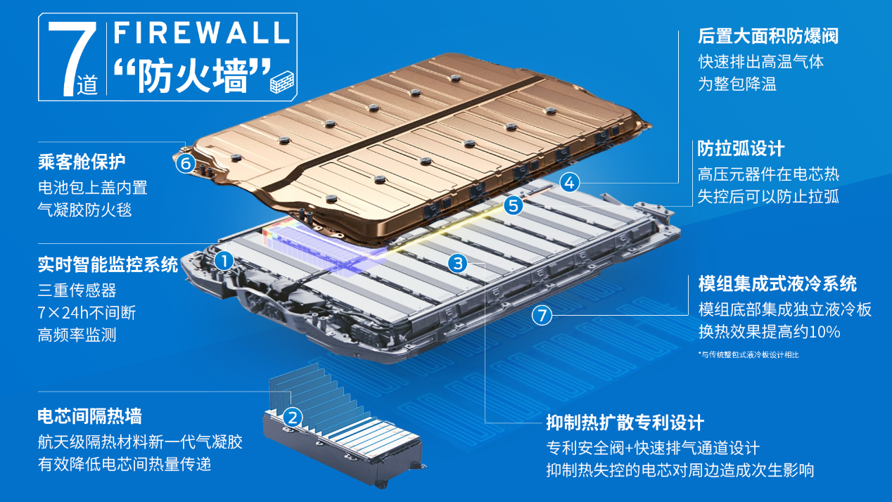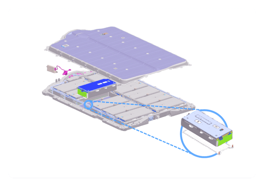 电池包每个模组都配置了专利设计的集成式独立液冷板,比起业内常用的电池包集中式液冷板设计,换热效果提高约10%;同时液冷系统通过独特的流量控制,可以控制电芯间的温差在1摄氏度,确保了电芯老化的一致,提升了电池寿命;在BDU电池分断单元里也放置了液冷板,它可以使BDU单元支持>1200A的峰值电流负载,发热最高温度<65°C,消除对周围零件的热影响。模组和整包运用上盖防火专利设计,电池上盖内置气凝胶防火毯,对乘员和整车进一步保护。