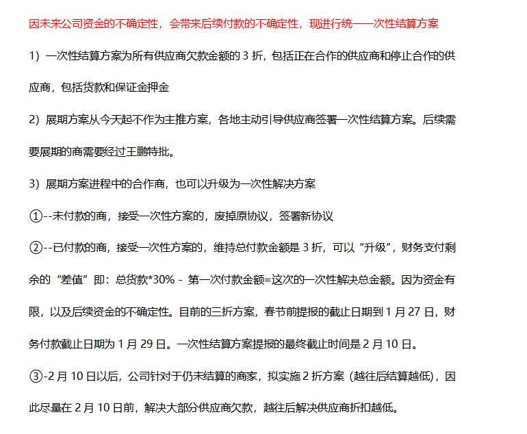 “1月初,有三名自称受十荟团总部委托的人来长沙处理欠款事宜,给供应商、网格仓加盟商一个分期付款协议方案——先付10%的欠款,余款分三年结清。”一位参与维权的长沙供应商向连线Insight回忆,“后来,湖南这边又给我一个3折一次性结算方案,也就是只结算货款的30%,若签了这个协议,上一个协议便作废。我选了后者,谁知道三年后,还有没有十荟团。”