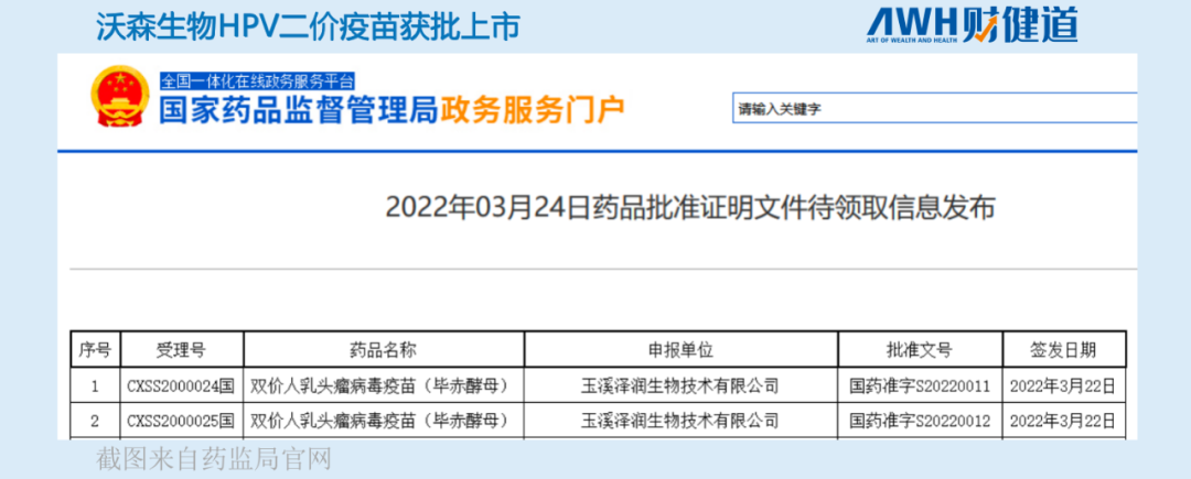 3月24日,国家药监局官网显示,沃森生物(300142.SZ)全资子公司旗下重组HPV二价疫苗正式获批上市,目前中国大陆市场获批使用的HPV疫苗增至5款。
