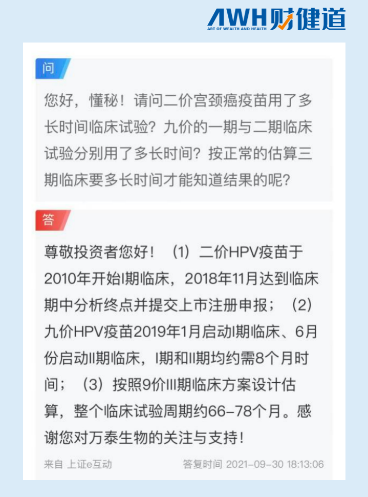 不过,在2021年9月在公众平台跟投资者互动时,万泰生物对于III期临床方案给出的时间规划表是66-78个月,也就是5.5-6.5年。按照其2020年9月5日III期首例入组来看,万泰生物的九价应该还有3-4年的时间才会进入报产阶段。